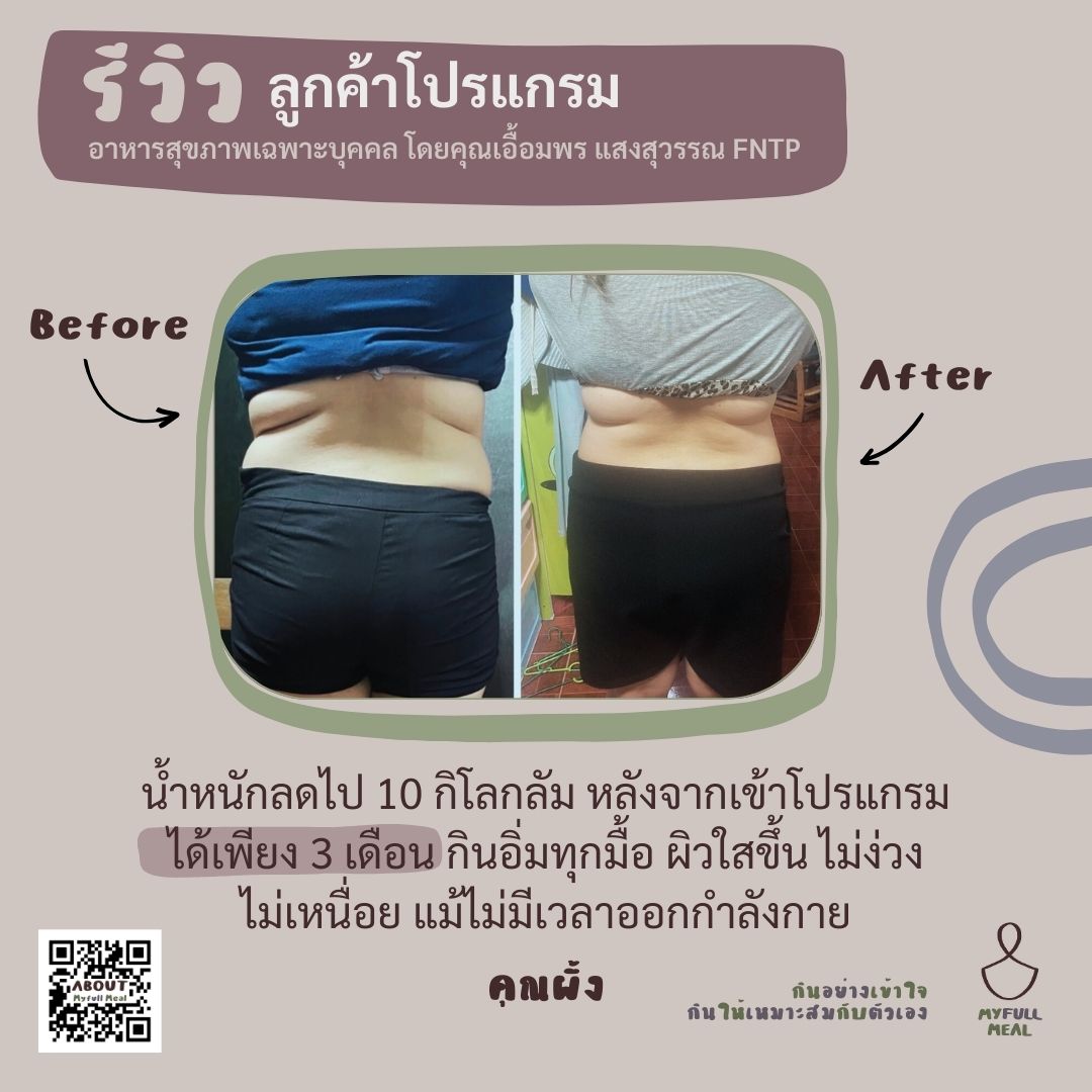 น้ำหนักลดไป 10 กิโลกรัม หลังจากเข้าโปรแกรมได้เพียง 3 เดือน กินอิ่มทุกมื้อ ผิวใสขึ้น ไม่ง่วง ไม่เหนื่อย แม้ไม่มีเวลาออกกำลังกาย