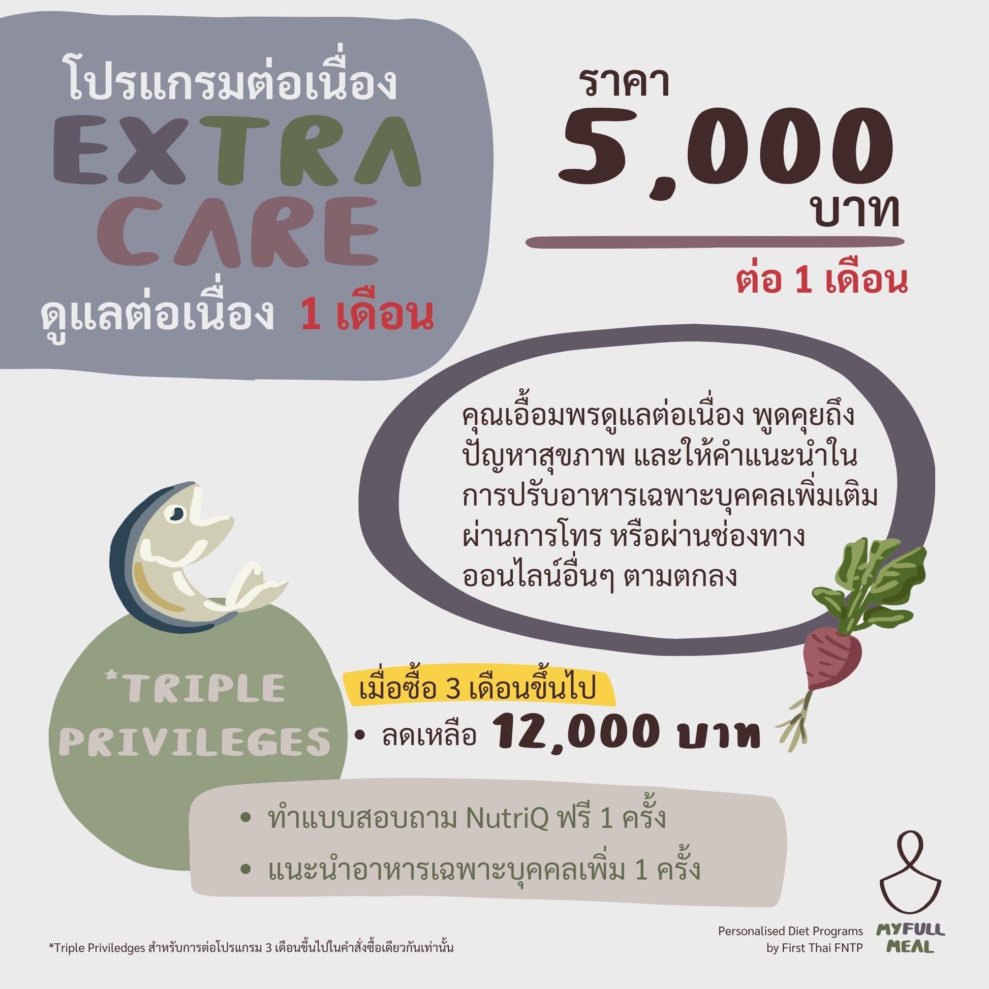 Our services, including (but not limited to) information, graphics, images, and other tools on Myfull Meal by First Thai FNTP social media accounts and website are provided for diet and wellness monitoring, informational and educational purposes, and does not constitute providing medical advice or services. Myfull Meal by First Thai FNTP’s information and services are not intended to replace professional medical advice, diagnosis or treatments.